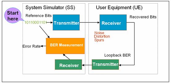环回测试设置:图1描述系统仿真器(测试装置)与UE在环回测试期间的块级连接。测试装置中产生的数据比特用“10110001101”码型表示,它在无线电承载测试模式连接期间由12.2kbps参考测量信道(RMC)发送到UE,如[1,2]所述。UE恢复该数据比特,并把同样数据再发送到测试装置。测试装置比较发送数据和接收数据,并由此计算出误码率。