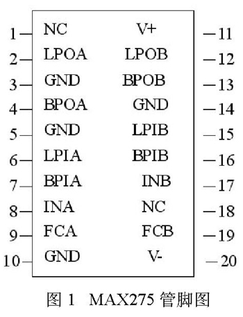 MAX275使用 5V电源,电源电流最大不超过30mA,引脚见图1。其中,后缀字母A、B表示所属第几组滤波单元,A为第一组,B为第二组(MAX275内只有两组滤波单元);IN表示输入端;BPI为带通输入;BPO为带通输出;LPO为低通输出;FC为工作方式及频率选择。