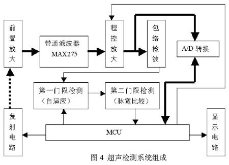 根据系统功能和理论分析,包络检波器加上双门限比较检测是最佳接收的结构。由于换能器余振的影响,实际实现时不能采用固定门限进行比较,而采用检测噪声作为自适应第一门限的时间检测方法。门限形成电路在包络检波器后对噪声进行采样,然后让这点采样电平经适量放大后按噪声拖尾的规律下降,当低于远距噪声门限电平后就不再下降,变成完全由接收机系统噪声决定的固定门限。脉冲干扰由于频谱较宽,在进入有一定通频带的接收机后被放大,第二门限取得较大就是为了抑止这种干扰。因此接收机的通频带不能太窄,当超过第一门限的信号达到一定宽度时才判为回波。
